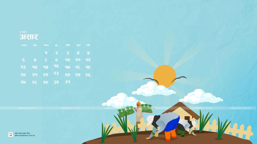 नेपाली पात्रोले आफ्ना प्रयोग कर्ता हरूको लागि यस उत्पादनमूलक असार महिनाको अवसरमा यस पात्रो मार्फत यस महिनाको महत्त्व झल्काउने वालपेपर्स प्रस्तुत गरेका छौ। प्रयोग कर्ता हरूको स्वाद अनुरूप अझ राम्रा वालपेपर्स आउँदा महिना हरूमा पनि प्रस्तुत गर्ने कार्यक्रम बनाउँदै गइरहेका छौ। यस वालपेपर्स प्रयोग गरी आफ्ना कम्युनिकेसन डिभाइस र पी.सी हरू रङ्गिन बनाउनु सकिनेछ।